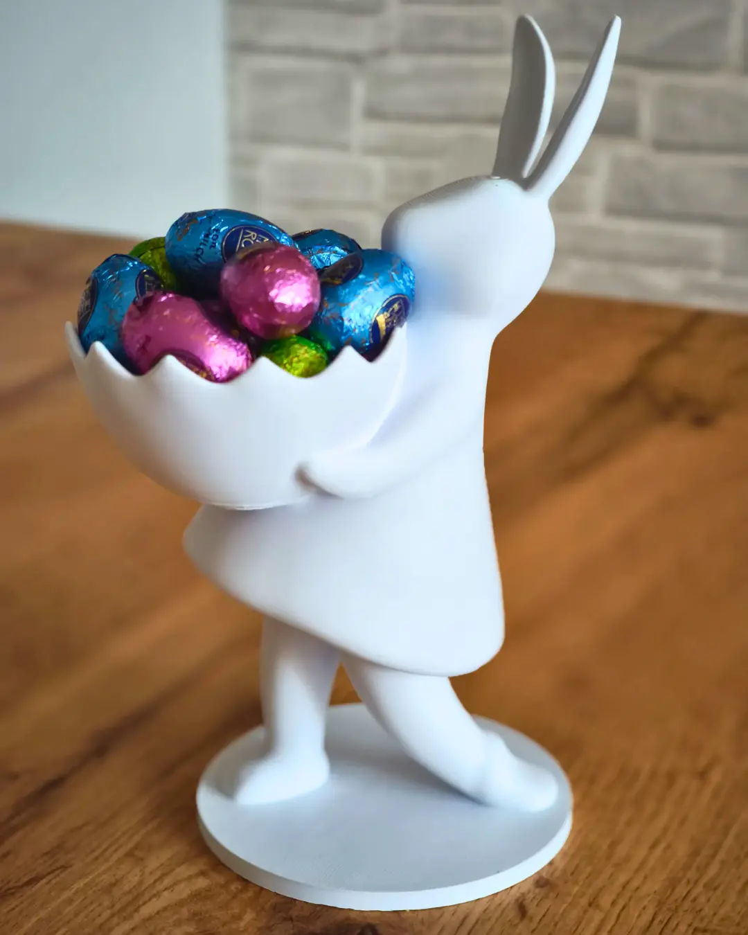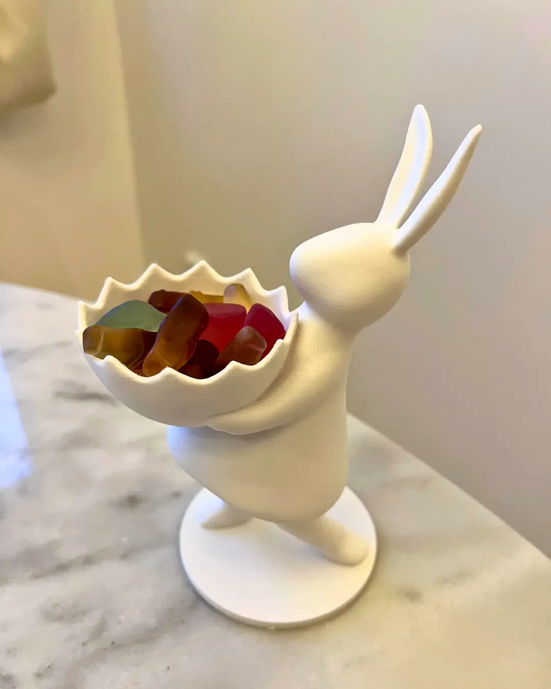 Bu figür, 3D baskı teknolojisiyle yüksek hassasiyetle üretildi. Bu sayede her detayı özenle işlendi. Ardından kaliteli boyalarla renklendirildi. Fakat bu özel modelde doğal beyaz tonlar tercih edildi. Böylece hem sade hem de zarif bir görünüm kazandı. Figürün tuttuğu kase ise dekoratif olduğu kadar işlevseldir. İçine çikolata, şeker, anahtarlık veya takı gibi küçük eşyalar konulabilir.