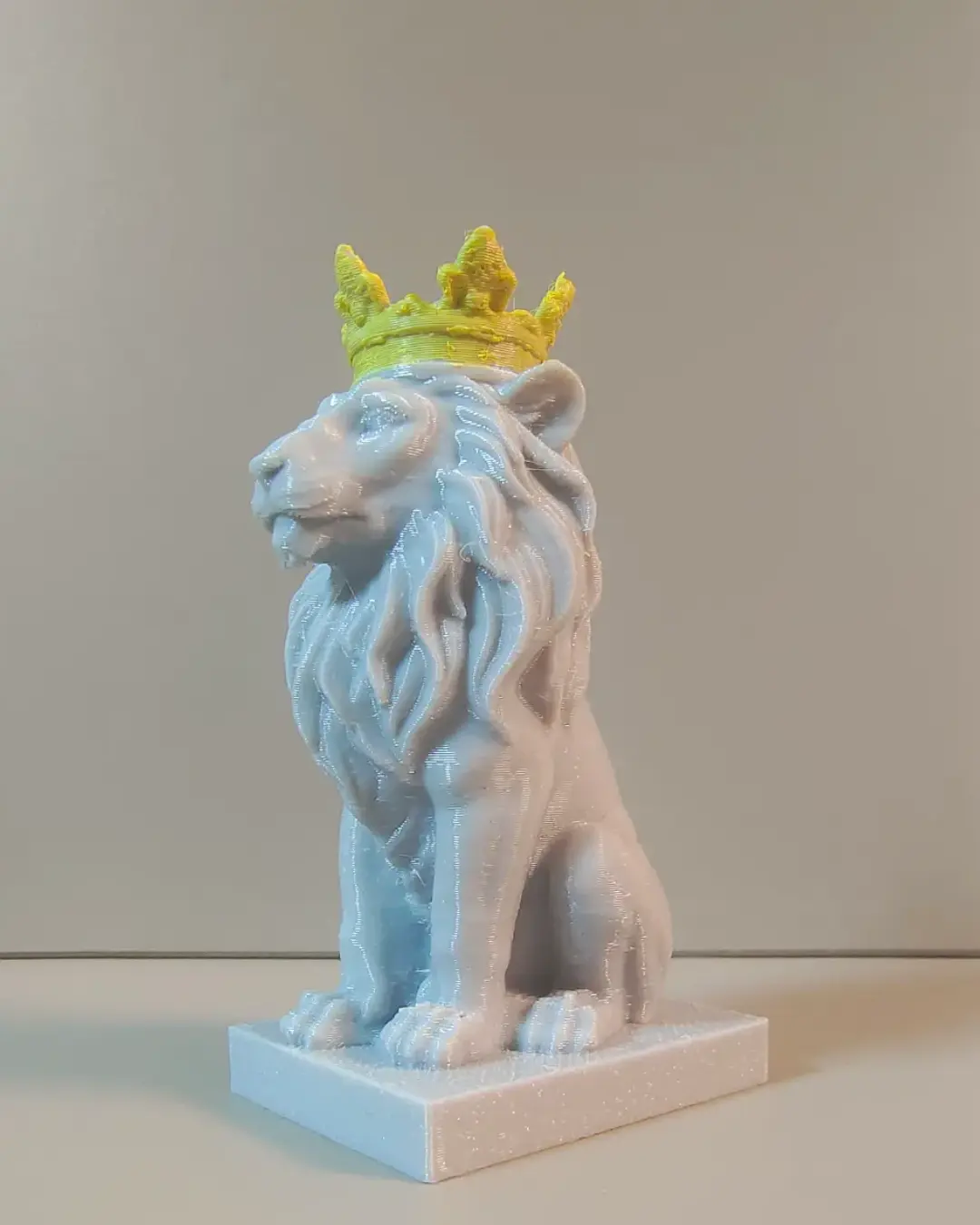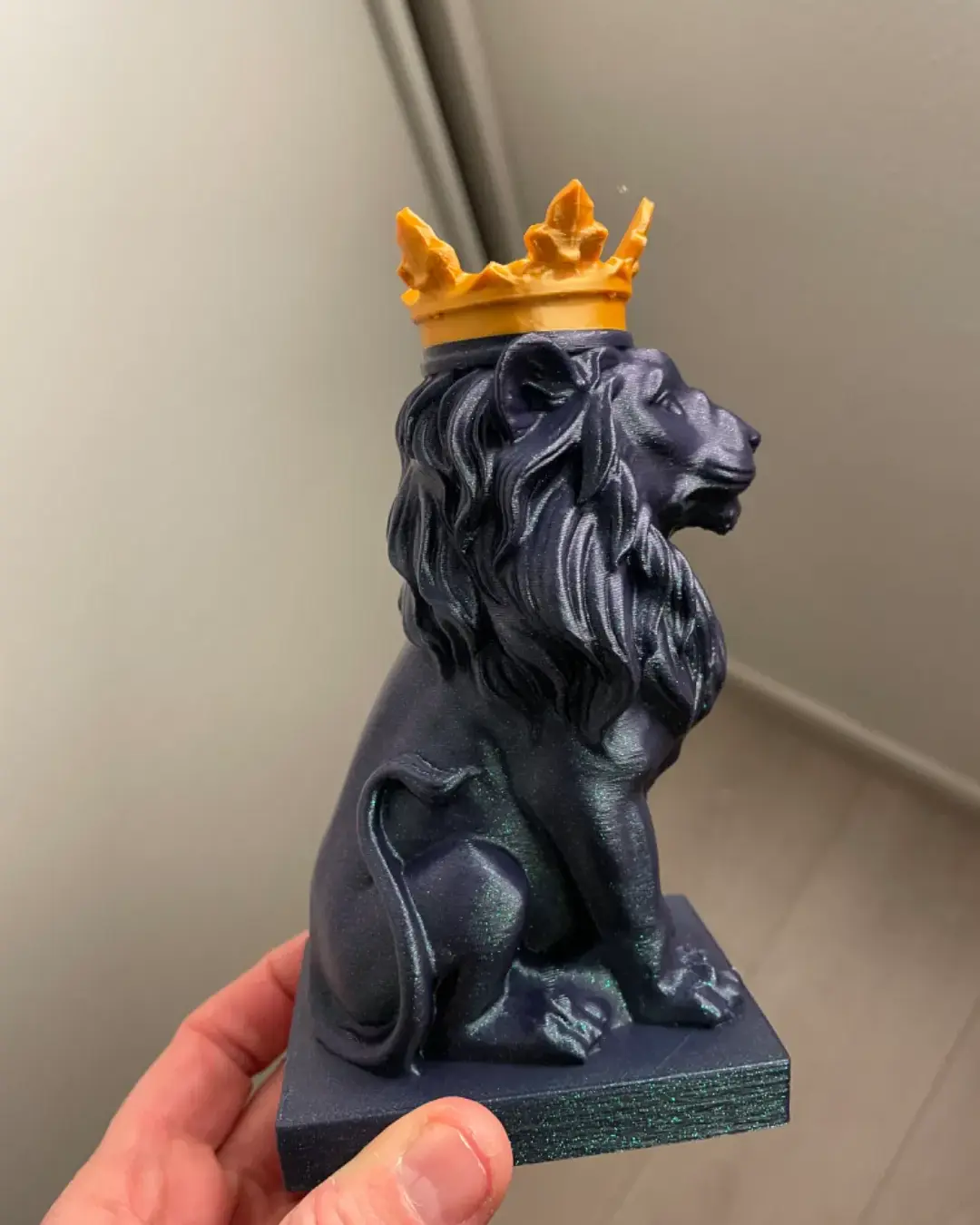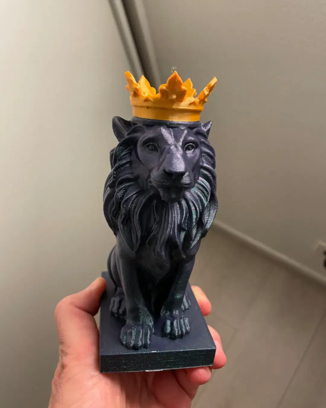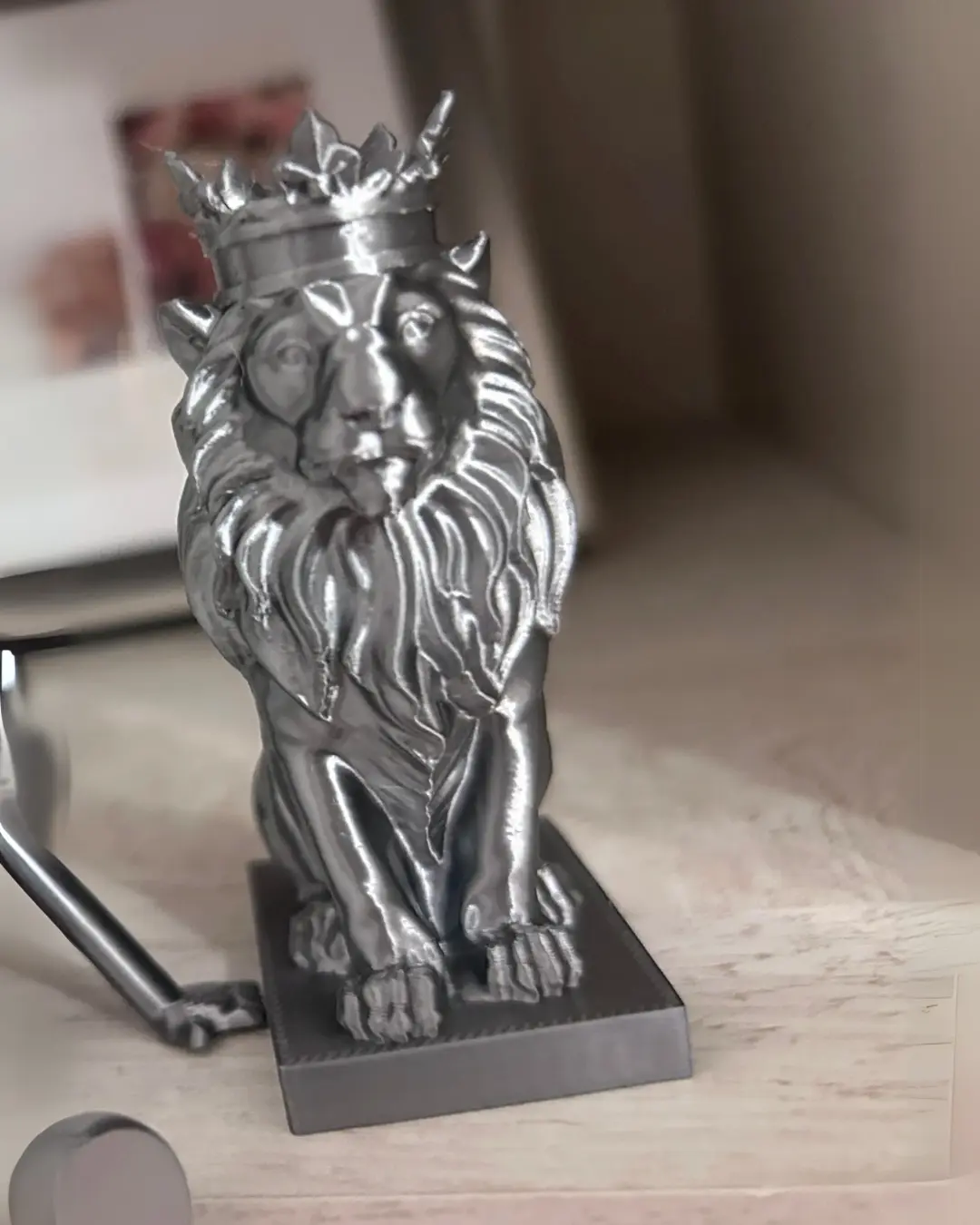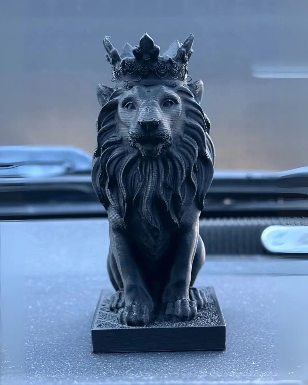 PLA malzemeden üretilmiş, 15 cm yüksekliğe sahip, siyah, beyaz ve gri renk seçenekli Taçlı Aslan Figürü.