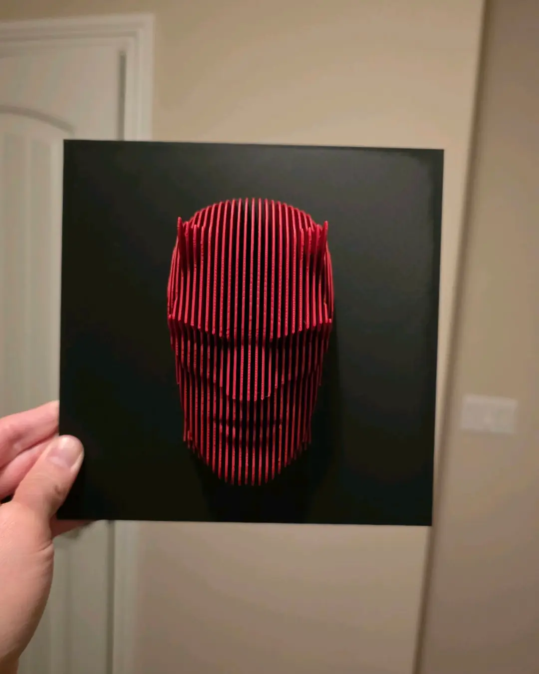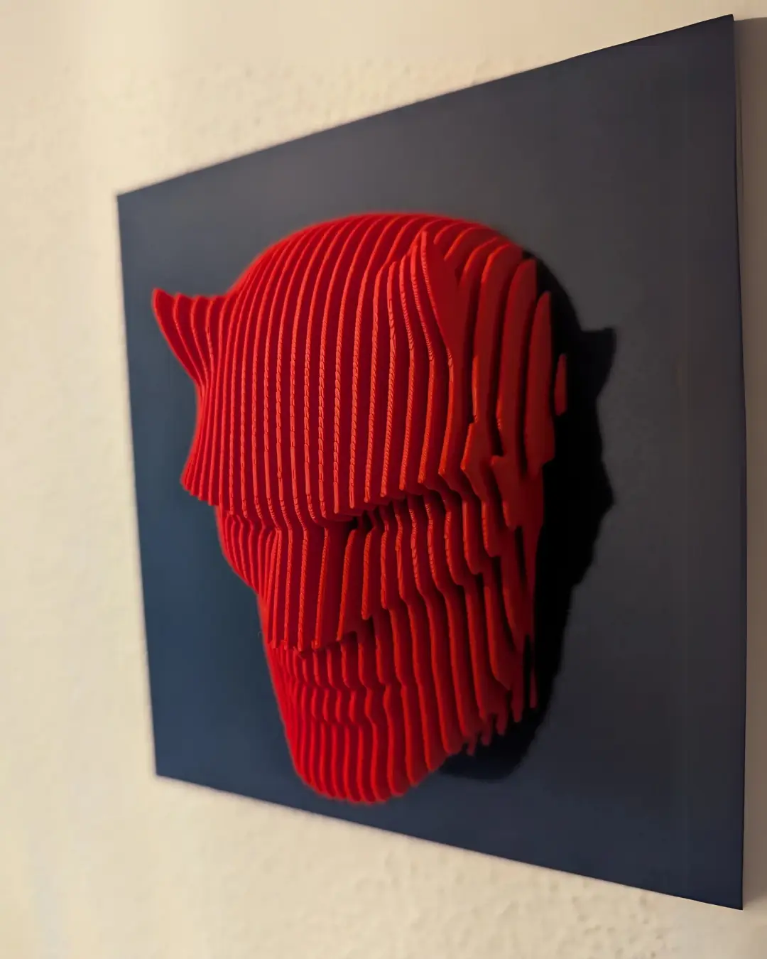 Siyah zemin üzerinde 3D baskı ile yapılmış kırmızı Dara Devil kafası bulunan dekoratif tablo. 20×20, 25×25 ve 30×30 cm boyut seçenekleriyle sunulur.
