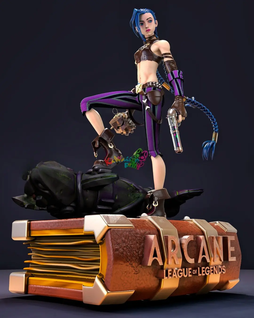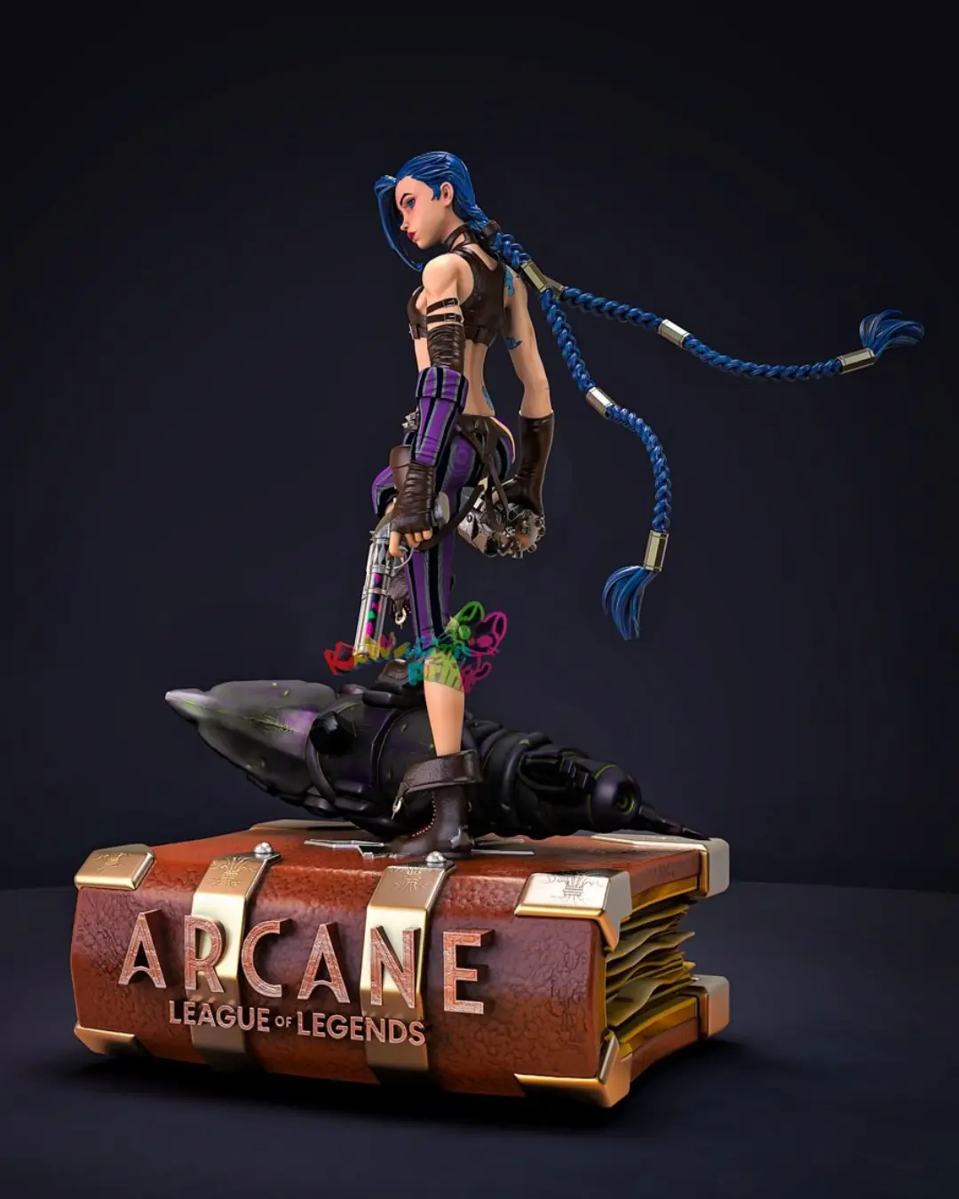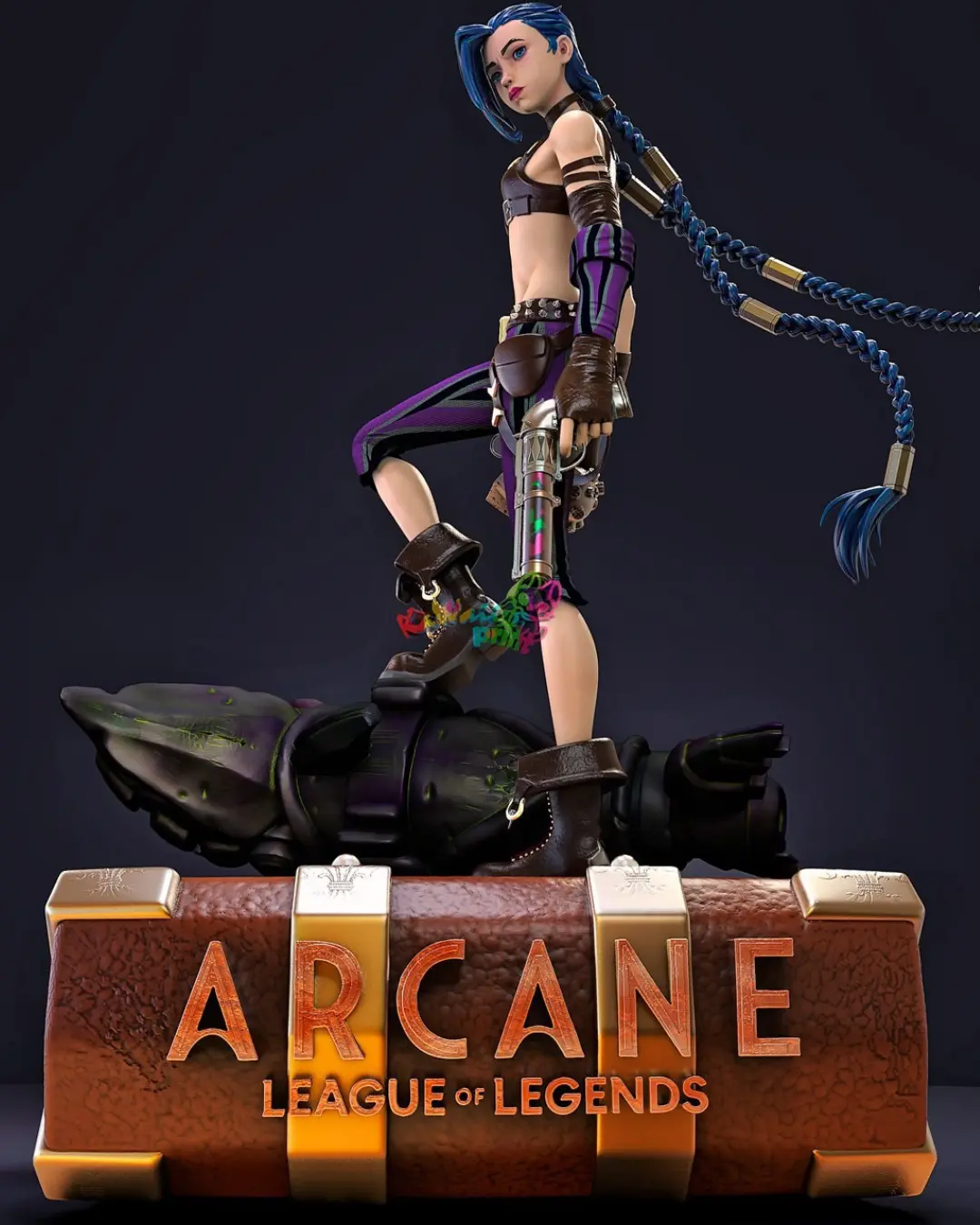 Jinx figürü, 20 cm, 25 cm ve 30 cm boyut seçenekleriyle üretilmiş olup, oyundaki karanlık ve sofistike tarzı birebir yansıtmaktadır.